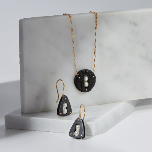 Precise hand hewn rivets capture gemstones and pearls in my signature rivet collection. Hand fabricated in solid argentium silver, solid gold, ebony wood or bi-metal, these have an architectural or industrial style.