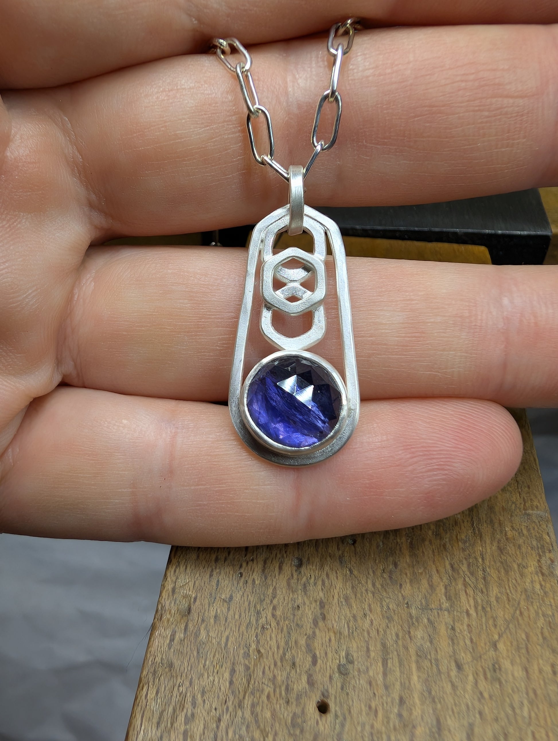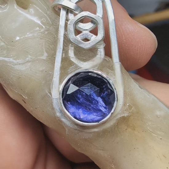 This Iolite pendant is great on a long chain, or stacked with you favorite charms. Hand fabricated in solid argentium silver, with just enough weight to keep it in place. The Iolite is a beautiful deep bluish purple.